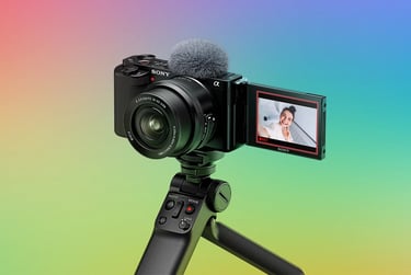 Le Sony Alpha ZV-E10 est un appareil photo vidéo hybride spécialisé dans la création de contenu. L'appareil propose une qualité 4K en HD ainsi qu'un enregistrement sonore de haute qualité (micro directionnel à 3 capsules intégrées) et est doté d'un autofocus parfait grâce à ses suivi des yeux du sujet en temps réel.