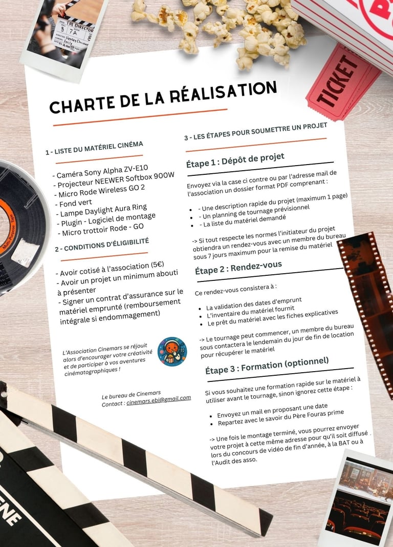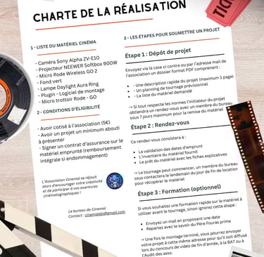 Comme dit précédemment, le but du pôle Réalisation est de donner la possibilité aux plus créatifs qui n'ont pas les moyens et qui ont envie de s'essayer à l’exercice pour un quelconque but (artistique, récréatif, professionnel) de se rassembler entre passionnés et de réaliser leur projet vidéo. Si vous êtes intéressés, il vous suffit d'envoyer votre demande sous forme de message ou lien wetransfer dans le communiqué en bas de page afin de suivre les étapes de la charte du court métrage.